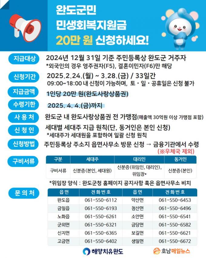 ¹Î»ýȸº¹Áö¿ø±Ý ½Åû ´ë»óÀº 2024³â 12¿ù 31ÀÏ ±âÁØ Áֹεî·Ï»ó ¿Ïµµ±º¿¡ ÁÖ¼Ò¸¦ µÐ ±º¹ÎÀ̰í, ¿Ü±¹ÀÎÀÇ °æ¿ì ¿µÁÖ±ÇÀÚ(F5), °áÈ¥ À̹ÎÀÚ(F6)¸¸ ÇØ´çµÈ´Ù. ½ÅûÀº ¼¼´ëÁÖ°¡ ¼¼´ë¿øÀ» Æ÷ÇÔÇÑ Á÷Á¢ ½ÅûÀÌ ¿øÄ¢ÀÌ¸ç º»ÀÎ ¿Ü ¼¼´ë¿ø ½ÅºÐÁõ±îÁö Àϰý ÁöÂüÇØ¾ß ÇÑ´Ù.