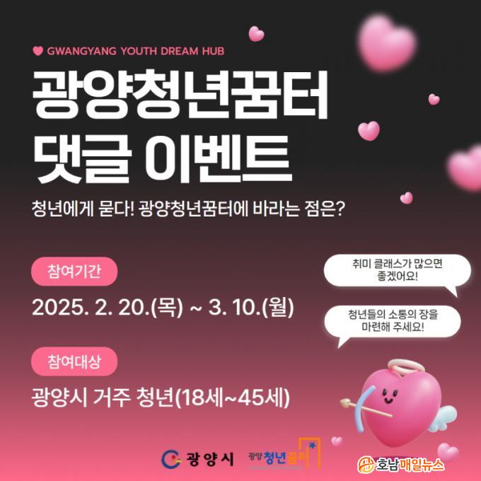 ±¤¾ç½Ã¿¡ °ÅÁÖÇÏ´Â 18¼¼ºÎÅÍ 45¼¼±îÁöÀÇ Ã»³âÀ̶ó¸é ´©±¸³ª À̹ø À̺¥Æ®¿¡ Âü¿©ÇÒ ¼ö ÀÖ´Ù. Âü¿© ¹æ¹ýÀº °£´ÜÇÏ´Ù. ¸ÕÀú ±¤¾çû³â²ÞÅÍ ÀνºÅ¸±×·¥(@gy_youth)À» ÆÈ·Î¿ìÇϰųª ³×À̹ö ºí·Î±×(blog.naver.com/youthcenter_gy)¸¦ ÀÌ¿ô Ãß°¡ÇÑ µÚ, ¡®±¤¾çû³â²ÞÅÍ¿¡ ¹Ù¶ó´Â Á¡¡¯ °Ô½Ã±Û¿¡ Èñ¸Á ÇÁ·Î±×·¥À̳ª û³âÁ¤Ã¥¿¡ ´ëÇÑ ÀǰßÀ» ´ñ±Û·Î ÀÛ¼ºÇÏ¸é µÈ´Ù. ÀÌÈÄ, ÆÈ·Î¿ì ÀÎÁõ°ú ´ñ±Û ÀÛ¼º ȸéÀ» ³×À̹ö ÆûÀ¸·Î Á¦ÃâÇϸé Âü¿©°¡ ¿Ï·áµÈ´Ù.