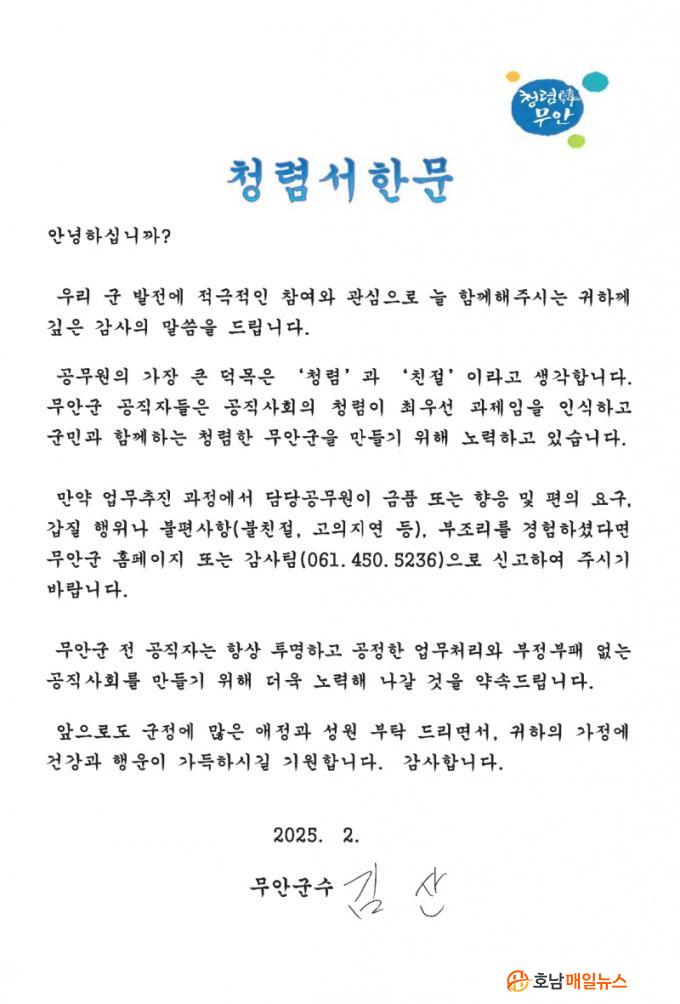 ±è»ê ±º¼ö´Â ¡°À̹ø ¼Çѹ® ¹ß¼ÛÀ» ÅëÇØ ¹Î°ü °£ÀÇ Ã»·Å ¹®È¸¦ È®»êÇϰí, °øÁ¤ÇÑ ÇàÁ¤ ¿î¿µÀ» À§ÇÑ ÀÇÁö¸¦ ºÐ¸íÈ÷ Àü´ÞÇϰíÀÚ ÇÑ´Ù¡±¸ç, ¡°Ã»·ÅÇÑ »çȸ¸¦ À§ÇØ Áö¿ª»çȸ¿Í ÇÔ²² ³ë·ÂÇϰڴ١±°í ¸»Çß´Ù.