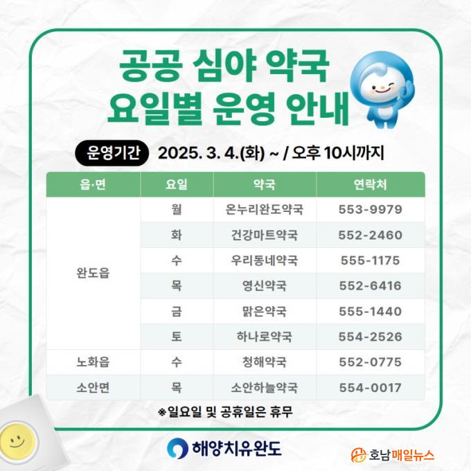 °ø°ø ½É¾ß ¾à±¹À¸·Î ÁöÁ¤µÈ °÷Àº ÃÑ 8°³¼Ò·Î ¿ÏµµÀ¾Àº 6°³¼Ò(¿Â´©¸®¿Ïµµ¾à±¹, °Ç°¸¶Æ®¾à±¹, ¿ì¸®µ¿³×¾à±¹, ¿µ½Å¾à±¹, ¸¼Àº¾à±¹, Çϳª·Î¾à±¹), ³ëÈÀ¾ 1°³¼Ò(Ã»ÇØ¾à±¹), ¼Ò¾È¸é 1°³¼Ò(¼Ò¾ÈÇϴþ౹) µîÀ̸ç, ¿äÀϺ°·Î 22½Ã±îÁö ¿î¿µÇÑ´Ù. ÀÏ¿äÀÏ ¹× °øÈÞÀÏÀº ¿î¿µÇÏÁö ¾Ê´Â´Ù.