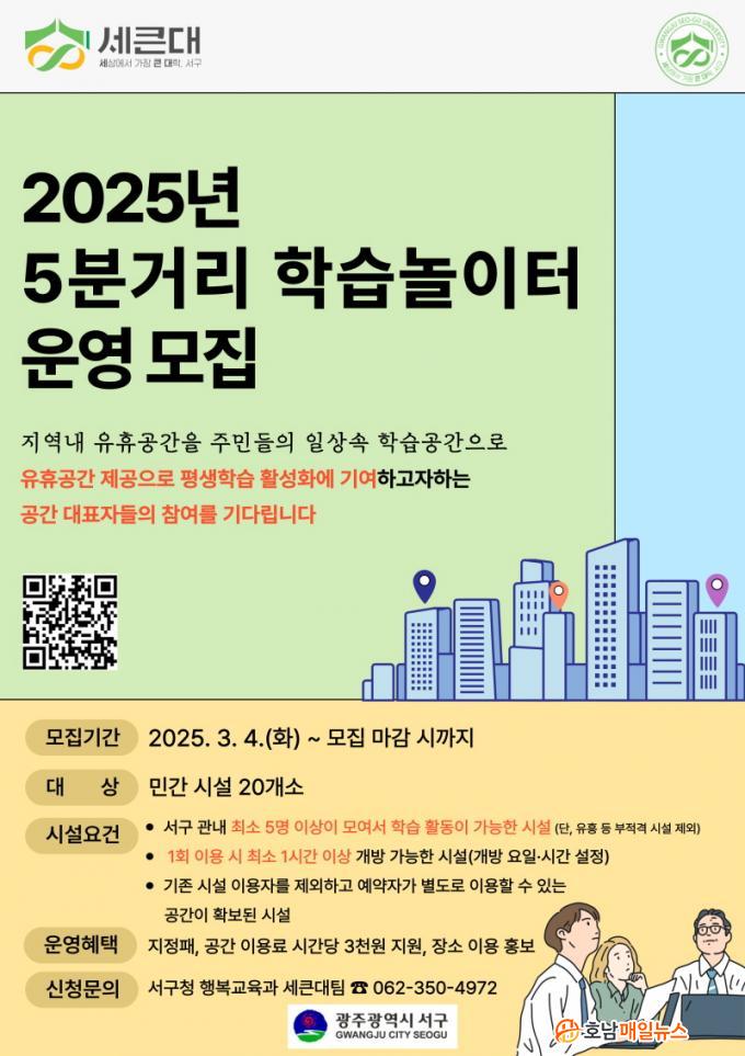 ¼±¸´Â ÇнÀ°ø°£ ÀûÇÕ¼º, ÁÖ¹ÎÀÇ Á¢±Ù¼º µîÀ» ½É»çÇØ ÇнÀ³îÀÌÅÍ 20°³¼Ò¸¦ ÁöÁ¤¡¤¿î¿µÇÒ ¿¹Á¤ÀÌ¸ç °ø°£ ÀÌ¿ë·á¸¦(½Ã°£´ç 3õ¿ø) Áö¿øÇÑ´Ù. ½ÅûÀº °ü·Ã ¼·ù¸¦ ÀüÀÚ¿ìÆí(injuly9635@korea.kr)À¸·Î Á¦ÃâÇÏ¸é µÇ°í ÀÚ¼¼ÇÑ ³»¿ëÀº ¼±¸Ã» Çູ±³À°°ú(062-350-4972)·Î ¹®ÀÇÇÏ¸é µÈ´Ù.