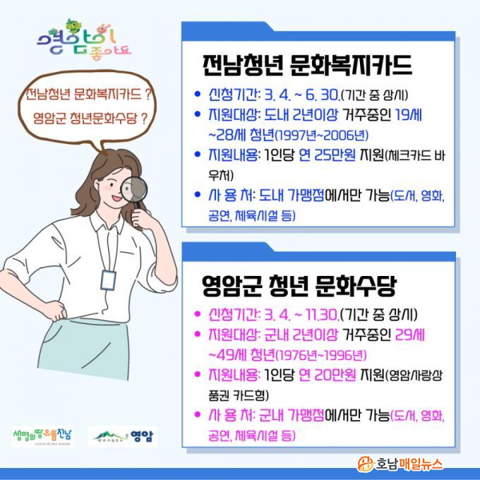 û³â ¹®Èº¹Áöºñ·Î 19~28¼¼¿¡°Ô´Â ¡®Àü³² û³â¹®Èº¹ÁöÄ«µå¡¯ 25¸¸¿øÀ», 29~49¼¼¿¡°Ô´Â ¡®¿µ¾Ï±º û³â¹®È¼ö´ç¡¯ Áö¿ªÈÆó 20¸¸¿øÀ» °¢°¢ Áö±ÞÇϱâ·Î ÇÑ °Í. ¿µ¾Ï û³âµéÀº ÀÌ ¹®Èº¹Áöºñ·Î °ø¿¬¡¤Àü½Ã¡¤¿µÈ °ü¶÷, Çпø ¼ö°, µµ¼ ±¸ÀÔ µî ´Ù¾çÇÑ ¹®È»ýȰÀ» ´©¸± ¼ö ÀÖ´Ù.