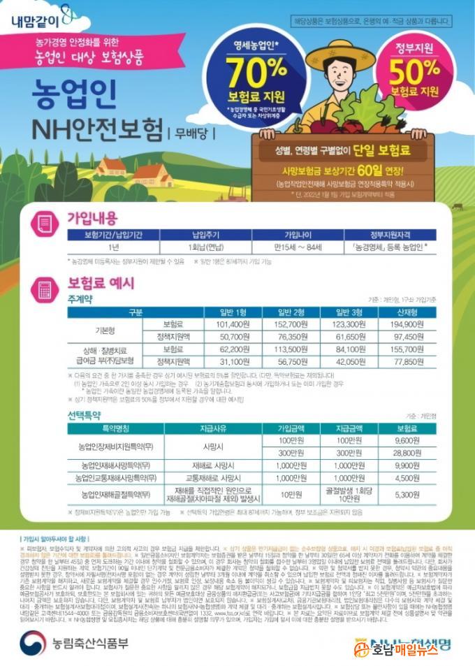 ƯÈ÷, ³ó¾÷°æ¿µÃ¼¿¡ µî·ÏµÈ °¡Á·°ú µ¿½Ã °¡ÀÔÇϰųª, ³óÀÛ¾÷ ÀçÇØ¿¹¹æ ±³À° µîÀ» ¼ö·áÇϸé ÁÖ°è¾à º¸Çè·áÀÇ 5%¸¦ Ãß°¡·Î ÇÒÀιÞÀ» ¼ö ÀÖ´Ù. º¸Çè º¸Àå ±â°£Àº 1³âÀÌ´Ù. ÁÖ¿ä º¸Àå »çÇ×Àº ¡ã³óÀÛ¾÷ ÀçÇØ À¯Á·±Þ¿©±Ý 6õ¸¸ ¿ø ¡ãÀå·Êºñ 100¸¸ ¿ø ¡ã°íµµ ÀåÇØ±Þ¿©±Ý 5õ¸¸ ¿ø ¡ã°£º´±Þ¿©±Ý 500¸¸ ¿ø ¡ãÈÞ¾÷(ÀÔ¿ø) ±Þ¿©±Ý 1ÀÏ´ç 2¸¸ ¿ø µîÀÌ´Ù.