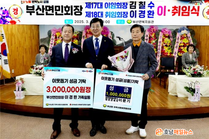 Çà»ç¿¡ ¾Õ¼ À̰æÈ¯ ½ÅÀÓ ¸é¹ÎȸÀå´Ô°ú ºÎ»ê¸é Ãâ½Å À̹®±â´Ô²²¼ Ãë¾à °èÃþÀ» À§ÇÑ ÀÌ¿ôµ½±â ¼º±ÝÀ» ±âŹÇÏ¿© Çà»ç¿¡ Àǹ̸¦ ´õÇß´Ù. ÀÌ¾î¼ ±èÄ¥¼ö îñ¸é¹ÎȸÀåÀÇ °ø·ÎÆÐ ¼ö¿©¿Í ÀÌÀÓ»ç, ½ÅÀÓ ¸é¹ÎȸÀåÀÇ ÃëÀÓ»ç ¼øÀ¸·Î ÁøÇàµÆ´Ù.