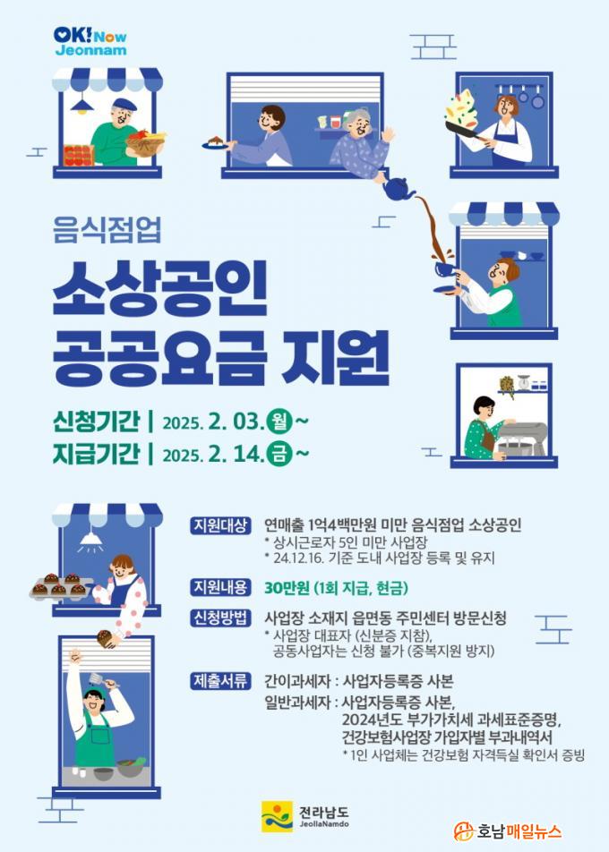 Áö¿ø ´ë»óÀÚ´Â 2024³â 12¿ù 16ÀÏ ÇöÀç Àü³²¿¡ »ç¾÷ÀåÀ» µî·ÏÇÏ°í ½Åû ±â°£±îÁö »ç¾÷À» À¯Áö ÁßÀÎ À½½ÄÁ¡¾÷ ¼Ò»ó°øÀÎÀ¸·Î »ó½Ã±Ù·ÎÀÚ 5ÀÎ ¹Ì¸¸, ¿¬¸ÅÃâ¾×Àº 1¾ï 400¸¸ ¿øÀ» ³ÑÁö ¾Ê¾Æ¾ß ÇÑ´Ù.