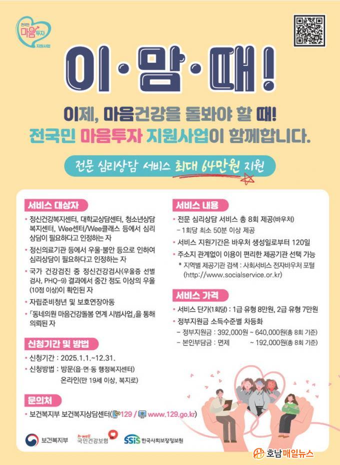 Áö¿ø ´ë»óÀº ¡ãÁ¤½Å°Ç°º¹Áö¼¾ÅÍ, ´ëÇб³ »ó´ã¼¾ÅÍ, û¼Ò³â»ó´ãº¹Áö¼¾ÅÍ, Wee¼¾ÅÍ ¹× Wee Ŭ·¡½º, Á¤½ÅÀÇ·á±â°ü µî¿¡¼ ½É¸®»ó´ãÀÌ ÇÊ¿äÇÏ´Ù°í ÀÎÁ¤¹ÞÀº ½Ã¹Î ¡ãÀÚ¸³Áغñû³â ¹× º¸È£¿¬À徯µ¿ ¡ã±¹°¡°Ç°°ËÁø¿¡¼ Áß°£ Á¤µµ ÀÌ»óÀÇ ¿ì¿ïÀÌ È®ÀÎµÈ ½Ã¹ÎÀÌ´Ù.