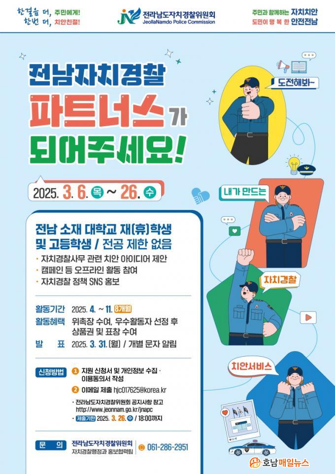ÀÚÄ¡°æÂû¿¡ °ü½ÉÀÌ ¸¹°í ¿Á¤ ÀÖ´Â Àü³²Áö¿ª ´ëÇлýÀ̳ª °íµîÇлýÀÌ¸é °³ÀÎ ¶Ç´Â ÆÀÀ» ±¸¼ºÇØ ´©±¸³ª Áö¿øÇÒ ¼ö ÀÖ´Ù. Âü¿© ½ÅûÀº Àü³²ÀÚÄ¡°æÂûÀ§¿øÈ¸ ´©¸®Áý(www.jeonnam.go.kr/jnapc)¿¡¼ ¿Â¶óÀÎ ½Åû¼¸¦ ³»·Á¹Þ¾Æ À̸ÞÀÏ·Î Á¦ÃâÇÏ¸é µÈ´Ù.