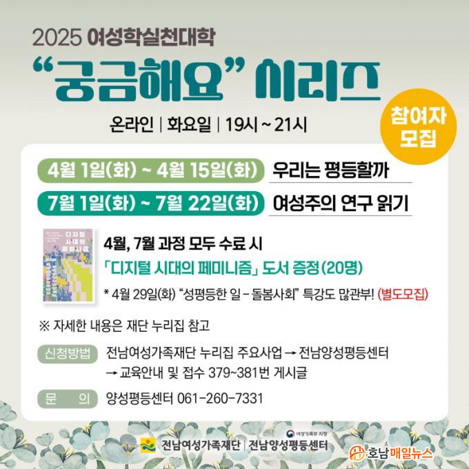 4¿ù¿¡´Â ¡®¿ì¸®´Â ÆòµîÇұ¸¦ ÁÖÁ¦·Î ¾öÇýÁø ±³¼ö(°æÈñ´ë Èĸ¶´ÏŸ½ºÄ®¸®Áö)ÀÇ °Àǰ¡ ÀÖ´Ù. µµ¹Î°úÀÇ Á¢Á¡ È®´ë¸¦ À§ÇØ ¿©¼ºÁÖÀÇ µµ¼ ÀúÀÚ¿ÍÀÇ ¸¸³²À» Áö¿ª µµ¼°ü, ÀÛÀº ¼Á¡ µî°ú ¿¬°èÇÏ¿© ¡®Ã£¾Æ°¡´Â ¿©¼ºÇнÇõ´ëÇС¯µµ ¿î¿µÇÒ °èȹÀÌ´Ù. 7¿ù¿¡´Â ¡®¿©¼ºÁÖÀÇ ¿¬±¸ Àб⡯¸¦ ÁÖÁ¦·Î ¿¬±¸ÀÚ¸¦ ÃʺùÇÏ¿© º¯ÈÇÏ´Â ½Ã´ëÀÇ »õ È帧À» ÇÔ²² ÇнÀÇÒ ¿¹Á¤ÀÌ´Ù.
