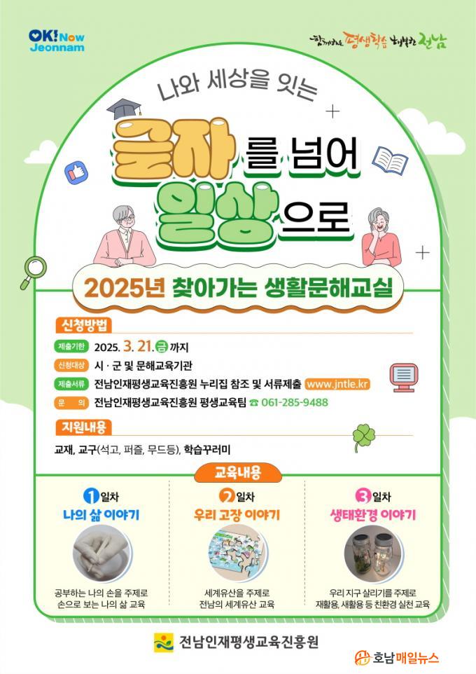 Âü¿©¸¦ ¹Ù¶ó´Â ¹®Çر³À° ±â°üÀº ¿À´Â 21ÀϱîÁö ÇØ´ç ½Ã±º¿¡ Á¢¼öÇÒ ¼ö ÀÖÀ¸¸ç, ÀÚ¼¼ÇÑ »çÇ×Àº Àü³²ÀÎÀçÆò»ý±³À°ÁøÈï¿ø Æò»ý±³À°ÆÀ(061-285-9488)À¸·Î ¹®ÀÇÇÏ¸é µÈ´Ù.