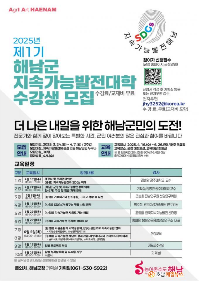 Á¦1±â ÇØ³²±º Áö¼Ó°¡´É¹ßÀü´ëÇÐÀÇ ¼ö°»ýÀº 4¿ù 7ÀϱîÁö ¸ðÁýÇÑ´Ù. ¿ÃÇØ óÀ½ °³¼³µÇ´ÂÇØ³²±º Áö¼Ó°¡´É¹ßÀü´ëÇÐÀº Áö¼Ó°¡´É¹ßÀü±³À° ÇÁ·Î±×·¥À» ÅëÇØ Áö¿ªÈ°µ¿°¡¸¦ ¾ç¼ºÇϰí, ¼ö·áÀÚ °£ ³×Æ®¿öÅ©¸¦ Çü¼ºÇØ Áö¼Ó°¡´É¹ßÀü Á¤Ã¥À» Áö¿ª»çȸ¿¡ È®»êÇϱâ À§ÇØ ¸¶·ÃµÆ´Ù.