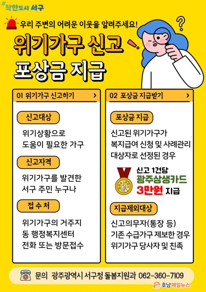 Æ÷»ó±ÝÀº ¡ã±âÃÊ»ýȰ¼ö±ÞÀÚ ¡ãÂ÷»óÀ§°èÃþ ¡ãÇѺθð°¡Á· ¡ã±ä±ÞÁö¿ø ½ÅûÀÚ ¡ãµ¿ »ç·Ê°ü¸® ´ë»óÀÚ·Î ¼±Á¤µÈ °¡±¸¸¦ ½Å°íÇÑ °æ¿ì 1°Ç´ç 3¸¸¿øÀ» ±¤ÁÖ»ó»ýÄ«µå·Î Áö±ÞÇϸç, µ¿ÀÏ ½Å°íÀÚ¿¡ ´ëÇÑ Áö±Þ Çѵµ´Â ÃÖ´ë 15¸¸ ¿øÀÌ´Ù. ´Ü »çȸº¸Àå±Þ¿©¹ý¿¡ µû¸¥ ½Å°í Àǹ«ÀÚ, °ø¹«¿ø, À§±â°¡±¸ ´ç»çÀÚ ¹× Ä£Á·, ÀÌ¹Ì º¹Áö¼ºñ½º¸¦ ¹Þ´Â ¼ö±Þ°¡±¸¸¦ ½Å°íÇÑ °æ¿ì´Â Áö±Þ ´ë»ó¿¡¼ Á¦¿ÜµÈ´Ù.