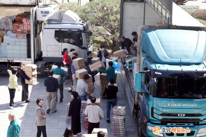 ºÏ±¸¿¡¼ ÁغñÇÑ ¡ã»ý¼ö(5,000°³) ¡ã»§(2,000°³) ¡ã¶ó¸é(315¹Ú½º) ¡ã¸¶½ºÅ©(42,000°³) ¡ã´ã¿ä(300°³) µî ÃÑ 5õ 2¹é¿©¸¸ ¿ø »ó´çÀÇ ±¸È£¹°Ç°À» ½ÇÀº Æ®·°ÀÌ ¿À´Ã ¿ÀÈÄ 3½Ã¿¡ »êû°ú Çϵ¿À¸·Î Ãâ¹ßÇß´Ù.