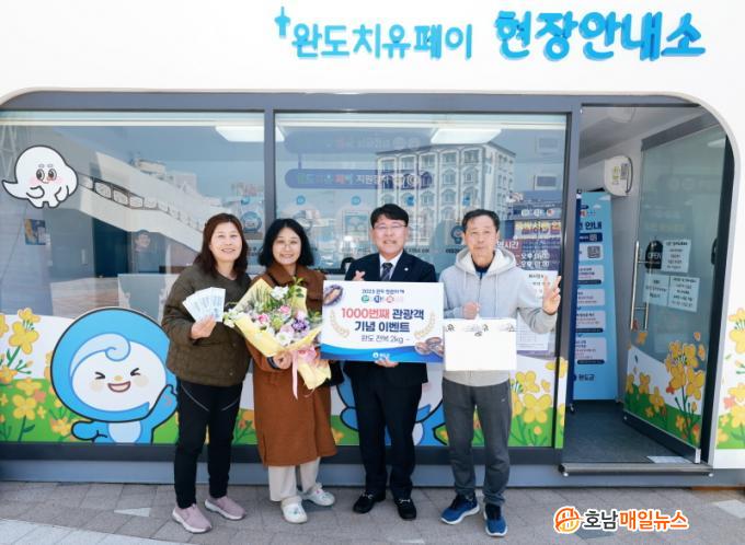 À̺¥Æ®´Â °ü±¤°´¿¡°Ô ¿Ïµµ ¹æ¹®¿¡ ´ëÇÑ °¨»çÀÇ ¸¶À½À» ÀüÇϰíÀÚ ¸¶·ÃÇßÀ¸¸ç, À̳¯ ±è¾çÈÆ ¿Ïµµ±ºÀÇȸ ÀÇÀåÀÌ ¿ÏµµÄ¡À¯Æä½ºÅ¸ ÇöÀå ¾È³»¼Ò¸¦ ã¾Æ 1,000¹øÂ° À̿밴¿¡°Ô ¿Ïµµ Ä¡À¯ ÆäÀÌ¿Í Æ¯»êǰ(Àüº¹ 2kg)À» Àü´ÞÇß´Ù.