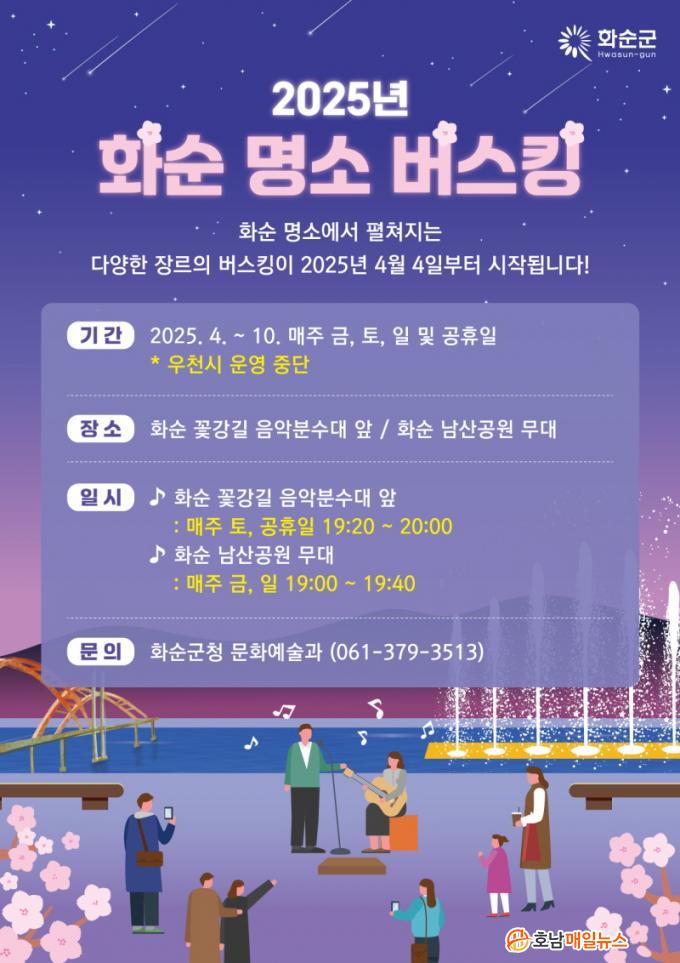 4¿ùºÎÅÍ 10¿ù±îÁö ¸ÅÁÖ ±Ý¿äÀÏ, ÀÏ¿äÀÏÀº ³²»ê°ø¿ø ¹«´ë¿¡¼ ¿ÀÈÄ 7½Ã ¹ö½ºÅ· °ø¿¬ÀÌ ÆîÃÄÁö¸ç, Åä¿äÀϰú °øÈÞÀÏ¿¡´Â ²É°±æ À½¾ÇºÐ¼ö´ë ¾Õ¿¡¼ ¿ÀÈÄ 7½Ã 20ºÐºÎÅÍ ¾à 40ºÐ°£ °ø¿¬ÇÒ ¿¹Á¤ÀÌ´Ù. ¿ìõ°ú Æø¿° µî ±â»ó »óȲ ¾ÇÈ ½Ã¿¡´Â °ø¿¬ÀÌ ÀÚµ¿ Ãë¼ÒµÈ´Ù.
