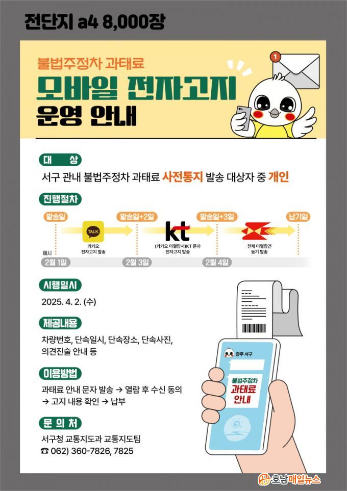 ÀÌ¿¡ ¼±¸´Â 4¿ùºÎÅÍ °úÅÂ·á °íÁö ´ë»óÀÚÀÇ Á¢±Ù¼º°ú ³³ºÎ ÆíÀǼºÀ» ³ôÀ̱â À§ÇØ ¸ð¹ÙÀÏ ÀüÀÚ°íÁö ¼ºñ½º¸¦ µµÀÔÇØ ¿î¿µ ÁßÀÌ´Ù. ÀÌ ¼ºñ½º´Â ÁÖÁ¤Â÷ À§¹Ý Â÷·® ¼ÒÀ¯ÀÚ¿¡°Ô īī¿ÀÅå°ú KT°ø°ø¾Ë¸²¹®ÀÚ·Î ÀüÀÚ°íÁö¼¸¦ ¼øÂ÷ÀûÀ¸·Î ¹ß¼ÛÇϰí 3ÀÏ À̳»¿¡ ¿¶÷ÇÏÁö ¾ÊÀ¸¸é Ãß°¡·Î Á¾À̰íÁö¼¸¦ ¿ìÆíÀ¸·Î ¹ß¼ÛÇϰí ÀÖ´Ù.