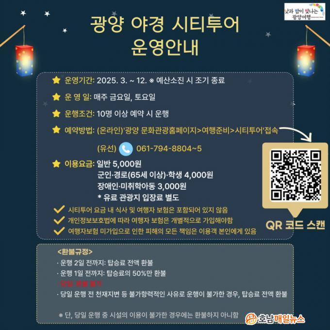 ±¤¾ç½ÃƼÅõ¾î °ü³»ÄÚ½º´Â 10¸í ÀÌ»ó Àοø ¿¹¾à ½Ã ¿îÇàÇϸç, Âü°¡ Èñ¸ÁÀÚ´Â Åõ¾î 3ÀÏ Àü±îÁö ÅëÇÕ¿¹¾à½Ã½ºÅÛ ¶Ç´Â À¯¼±(061-794-8804~5)À¸·Î ¿¹¾àÇØ¾ß ÇÑ´Ù.