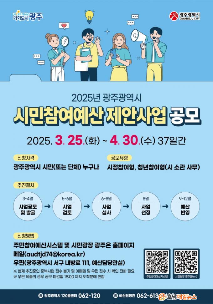 Âü¿©´Â ±¤Áֽà ´©¸®Áý(°í½Ã‧°ø°í)¿¡¼ ½Åû¼¸¦ ³»·Á¹Þ¾Æ ¡®±¤Áֽà ÁÖ¹ÎeÂü¿©½Ã½ºÅÛ¡¯(https://pb.lofin365.go.kr/gwangju/business/regBusinessInfoView2)°ú ¡®½Ã¹Î±¤Àå ±¤ÁÖ¿Â(ON)¡¯(https://gwangjuon.gwangju.go.kr)À» ÅëÇØ ¿Â¶óÀÎ Á¢¼öÇÏ¸é µÈ´Ù. ¸ÞÀÏ(audtjd74@korea.kr)À̳ª ¿ìÆí(±¤ÁÖ ¼±¸ ³»¹æ·Î111, ±¤Áֽà ¿¹»ê´ã´ç°ü½Ç)À¸·Îµµ Á¢¼öÇÒ ¼ö ÀÖ´Ù.
