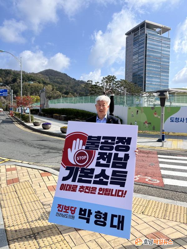 ¹ÚÇü´ë ÀÇ¿øÀº À̳¯ µµÃ» ¾Õ¿¡¼ ¡®ºÒ°øÁ¤ Àü³² ±âº»¼Òµæ, ÀÌ´ë·Î ÃßÁøÀº ¾ÈµË´Ï´Ù!¡¯¶ó´Â ¹®±¸°¡ ÀûÈù ÇÇÄÏÀ» µé°í °Å¸®¿¡ ³ª¼¹À¸¸ç, Àü³²µµÀÇȸ º»È¸Àǰ¡ ¿¸®±â Àü ȸÀÇÀå ¾Õ¿¡¼µµ 1ÀÎ ½ÃÀ§¸¦ À̾´Ù.