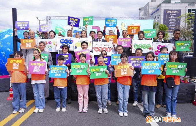 À̳¯ Çà»ç¿¡´Â °±âÁ¤ ±¤ÁÖ½ÃÀå°ú ½Å¼öÁ¤ ±¤ÁÖ½ÃÀÇȸ ÀÇÀåÀ» ºñ·ÔÇØ ½Ã¹Î 1000¿©¸íÀÌ Âü°¡Çß´Ù. ¿ÃÇØ ¡®Áö±¸ÀÇ ³¯¡¯ ½½·Î°ÇÀº ¡®¿ì¸®ÀÇ ÈûÀ¸·Î GREEN Áö±¸¡¯·Î, À̹ø ±â³äÇà»ç´Â ±âÈÄÀ§±â »óȲÀ» ÀνÄÇÏ°í »ýȰ ¼Ó ź¼ÒÁ߸³À» À§ÇÑ ÀÛÀº ½ÇõÀ» ÅëÇØ Áö±¸¸¦ ÇÔ²² ÁöŰÀÚ´Â Àǹ̷Π¿·È´Ù.