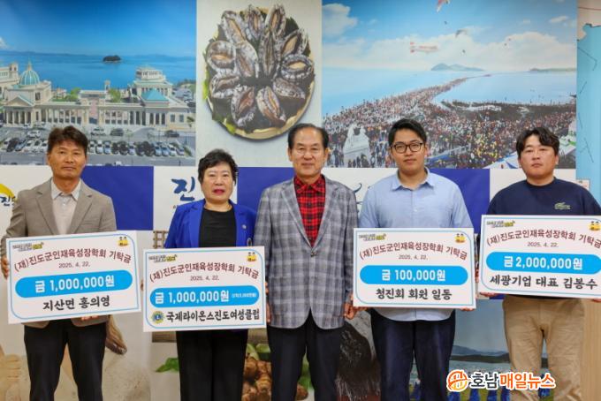 Áøµµ 3¡¤4¿ùÀÇ ³ª´® Àüµµ»ç ¡ãûÁøÈ¸(û³âÁøµµ¸ðÀÓ) 10¸¸ ¿ø ¡ã°í±º¸é Ç㱤¹« 100¸¸ ¿ø ¡ãÁ¦ÀÏŸī ´ëÇ¥ ±èÈñ¼÷ 500¸¸ ¿ø ¡ã±¹Á¦¶óÀ̿½ºÁøµµ¿©¼ºÅ¬·´ 100¸¸ ¿øÀ» ±âŹ ÇßÀ¸¸ç, À̵éÀº ¡°ÀÛÀº ³ª´®ÀÌÁö¸¸ ¿ì¸® Áö¿ª ÇлýµéÀÌ ²ÞÀ» ÇâÇØ ¹«ÇÑÈ÷ ³ª¾Æ°¡±æ ¹Ù¶ó´Â ¸¶À½À¸·Î ±âŹ¿¡ µ¿ÂüÇÏ°Ô µÆ´Ù. ¹Ì·¡ÀÎÀçµéÀÇ ²ÞÀ» ÀÀ¿øÇÏ´Â ³ª´®¿¡ Áö¼ÓÀûÀ¸·Î °ü½É°ú Áö¿øÀ» ¾Æ³¢Áö ¾Ê°Ú´Ù¡±¶ó°í ¸»Çß´Ù.
