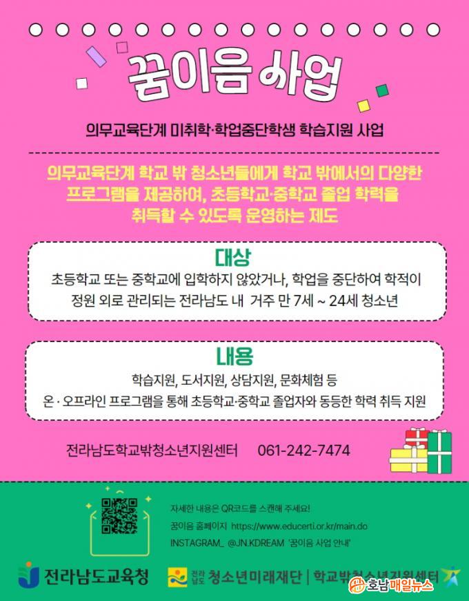 Àǹ«±³À°´Ü°èÀÎ ÃʵîÇб³, ÁßÇб³ °úÁ¤¿¡¼ ¹ÌÃëÇÐ ¶Ç´Â Çо÷Áß´Ü µîÀÇ ÀÌÀ¯·Î Çб³ ¹Û û¼Ò³âµéÀÌ Áö¼ÓÀûÀ¸·Î ¹ß»ýÇϰí ÀÖ´Ù. ÀÌ¿¡ ¡®²ÞÀÌÀ½¡¯¿¡¼´Â µµ³» Çб³ ¹Û û¼Ò³âÀ» ´ë»óÀ¸·Î ÇнÀÁö¿ø, µµ¼Áö¿ø, »ó´ãÁö¿ø µî ¿Â¡¤¿ÀÇÁ¶óÀÎ ÇÁ·Î±×·¥À» Á¦°øÇÑ´Ù.