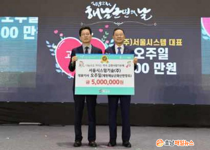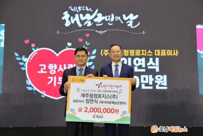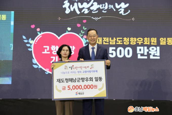 Àü¶ó³²µµÃ»¿¡¼ ±Ù¹«ÇÏ´Â ÇØ³² Ãâ½Å °øÁ÷ÀÚµé·Î ±¸¼ºµÈ ÀçÀü³²µµÃ»Çس²±º Çâ¿ìȸ¿¡¼µµ ÇØ³²±º °íÇâ»ç¶û±âºÎÁ¦ ÀÀ¿ø¿¡ ½Ê½ÃÀÏ¹Ý ¶æÀ» ¸ð¾Æ 500¸¸¿øÀ» ±âŹÇßÀ¸¸ç, ÇØ³²±º Ãâ½ÅÀ¸·Î Æó±â¹° ó¸® ¹× ÀÚ¿ø Àç»ý¾÷ü¸¦ ¿î¿µÇÏ´Â Á¦ÁÖûÁ¤·ÎÁö½º(ÁÖ) ÀÓ¿¬½Ä ´ëÇ¥´Â °íÇâ¿¡ ´ëÇÑ °¨»çÀÇ ¸¶À½À» ´ã¾Æ 200¸¸¿øÀ» ±âŹÇß´Ù.
