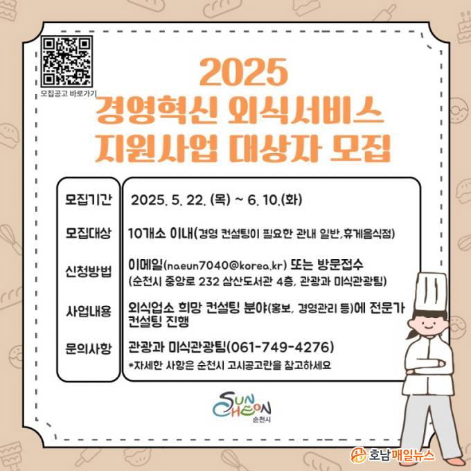 Áö¿øÀ» Èñ¸ÁÇÏ´Â ¿Ü½Ä¾÷¼Ò´Â ³»´Þ 10ÀϱîÁö ¼øÃµ½Ãû °í½Ã°ø°í¹®¿¡ °ÔÀçµÈ »ç¾÷ ½Åû¼¿Í °ü·Ã ¼·ù¸¦ ´ã´çÀÚ À̸ÞÀÏ(naeun7040@korea.kr) ¶Ç´Â ¼øÃµ½Ã °ü±¤°ú ¹Ì½Ä°ü±¤ÆÀ(061-749-4276)À¸·Î ¹æ¹® Á¢¼öÇÏ¸é µÈ´Ù.