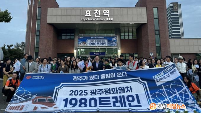 Ãâ¹ß Àü ȿõ¿ª±¤Àå¿¡¼´Â ¡®±¤ÁÖ°¡ ¿Ô´Ù, ÅëÀÏÀÌ ¿Â´Ù¡¯¸¦ ÁÖÁ¦·Î ÇÑ Ã⹫½ÄÀÌ ¿·È´Ù. °í±¤¿Ï ÇàÁ¤ºÎ½ÃÀåÀÌ ½Ã¹Î ´ëÇ¥¿¡°Ô 1980³â´ë ¿Â÷Ç¥¸¦ µðÀÚÀÎÇÑ ¡®ÆòÈÇà Æ¼ÄÏ¡¯À» Àü´ÞÇÏ´Â µî ÀÇ¹Ì ÀÖ´Â ½Ã°£À» °¡Á³´Ù.