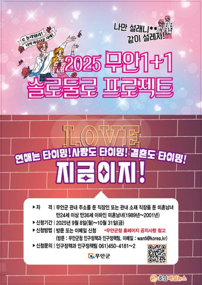 À̹ø ¼Ö·ÎµÑ·Î ÇÁ·ÎÁ§Æ® Âü°¡ ´ë»óÀº ¹«¾È±º °ÅÁÖ Á÷ÀåÀÎ ¶Ç´Â ±º³» Á÷ÀåÀ» µÐ ¹ÌÈ¥³²³à(1989~2001³â»ý, ¸¸ 24~36¼¼)À̸ç, ½ÅûÀº 2025³â 9¿ù 8ÀϺÎÅÍ 10¿ù 31ÀϱîÁö, ¹æ¹® ¶Ç´Â À̸ÞÀÏ(wanti@korea.kr)·Î ½ÅûÇÒ ¼ö ÀÖ´Ù. ÀÚ¼¼ÇÑ »çÇ×Àº ¹«¾È±ºÃ» ȨÆäÀÌÁö °øÁö»çÇ× ¶Ç´Â ¹«¾È±º Àα¸Á¤Ã¥°ú Àα¸Á¤Ã¥ÆÀ(¢Ï 061-450-4181)¿¡¼ È®ÀÎÇÒ ¼ö ÀÖ´Ù.