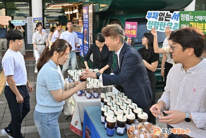 À̳¯ Ä·ÆäÀο¡¼´Â ¼±¸Ã» Á¤¹® ÃâÀÔ±¸¿¡¼ Ãâ±ÙÇÏ´Â Á÷¿øµé¿¡°Ô û·Å ¸í¾ðÀÌ ´ã±ä Æ÷ÃáÄíŰ¿Í Ä¿ÇÇ¡¤¿¡ÀÌµå µî À½·á¸¦ ÇÔ²² Á¦°øÇØ Ã»·Å ¸Þ½ÃÁö¸¦ ÀüÇß´Ù.