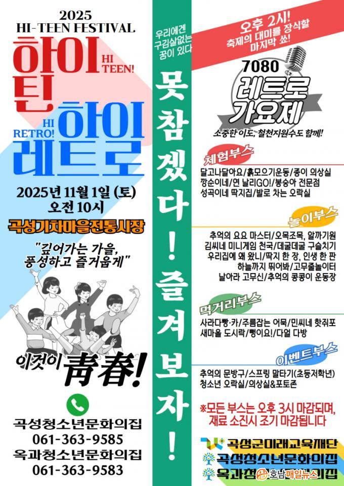 ÇÑÆí, 2025 °î¼ºÃ»¼Ò³â ÇÏÀÌÆ¾ Æä½ºÆ¼¹ú ¡®HI-TEEN, HI-RETRO¡¯´Â û¼Ò³âµéÀÇ ¹®ÈÀû °¨¼º°ú âÀǼºÀ» Ç¥ÇöÇÒ ¼ö ÀÖ´Â ÀåÀ¸·Î, RETRO °¡¿äÁ¦, üÇ衤³îÀÌ¡¤¸Ô°Å¸®¡¤À̺¥Æ® ºÎ½º µî ÃÑ 28°³ÀÇ ºÎ½º°¡ ¿î¿µµÉ ¿¹Á¤ÀÌ´Ù. Çà»ç´Â ¿À´Â 11¿ù 1ÀÏ °î¼º±âÂ÷¸¶À»ÀüÅë½ÃÀå ÀÏ¿ø¿¡¼ °³ÃÖµÉ ¿¹Á¤ÀÌ´Ù.