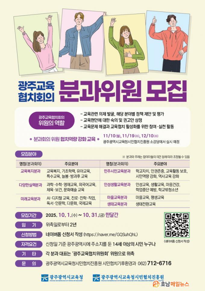 ¸ðÁýÀοøÀº 100¸í ³»¿ÜÀ̸ç, ±¤ÁÖ±³À°¿¡ °ü½É ÀÖ´Â 14¼¼ ÀÌ»ó ±¤ÁֽùÎÀÌ¸é ´©±¸³ª Âü¿© °¡´ÉÇÏ´Ù. 2±â À§¿øÀº ¿À´Â 11¿ùºÎÅÍ 2027³â 10¿ù±îÁö 2³â°£ ¡ãºÐ°úº° ȸÀÇ(»ó¡¤ÇϹݱ⠰¢ 2ȸ) ¡ã´ëǥȸÀÇ(¿¬ 2ȸ) ¡ãºÐ°úȸÀÇ ¿¬¼ö(¿¬ 1ȸ) µî¿¡ Âü¿©ÇÏ°Ô µÈ´Ù.