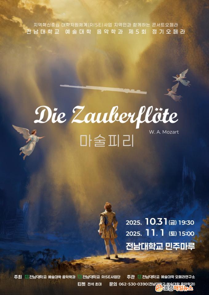 Àü³²´ë ¿¹¼ú´ëÇÐ À½¾ÇÇаú´Â ¿À´Â 10¿ù 31ÀÏ(±Ý) ¿ÀÈÄ 7½Ã 30ºÐ°ú 11¿ù 1ÀÏ(Åä) ¿ÀÈÄ 3½Ã, Àü³²´ëÇб³ ¹ÎÁÖ¸¶·ç¿¡¼ Á¦5ȸ Á¤±â¿ÀÆä¶ó ¡®¸¶¼úÇǸ®¡¯(Die Zauberflöte)¸¦ ¹«´ë¿¡ ¿Ã¸°´Ù.