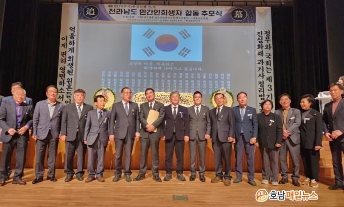 (»ç)Çѱ¹ÀüÀïÀüÈĹΰ£ÀÎÈñ»ýÀÚ Àü³²¿¬ÇÕȸ¿Í Àü³²µµ°¡ °³ÃÖÇÑ À̳¯ Ã߸ð½Ä¿¡´Â °À§¿ø Àü³²µµ °æÁ¦ºÎÁö»ç¿Í Áö¿ª ±¹È¸ÀÇ¿ø, ¿µ±¤±º¼ö, µµÀÇ¿ø, À¯Á·, µµ¹Î µî 300¿© ¸íÀÌ Âü¼®ÇØ ¾ö¼÷ÇÑ ºÐÀ§±â ¼Ó¿¡ Èñ»ý ¿µ·ÉÀ» Ã߸ðÇß´Ù.