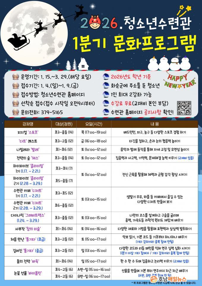 ÇÑÆí, 1¿ù 4ÀϺÎÅÍ 1¿ù 9ÀϱîÁö ȼø±ºÃ»¼Ò³â¼ö·Ã°ü ´©¸®Áý(https://hwasunyouth.kr/)¡®ÇÁ·Î±×·¥ ½Åû °Ô½ÃÆÇ¡¯À» ÅëÇØ ¿Â¶óÀÎÀ¸·Î Á¢¼öÇÏ¸é µÈ´Ù. 1ºÐ±â ÇÁ·Î±×·¥Àº 1¿ù 15ÀϺÎÅÍ 3¿ù 29ÀϱîÁö ¿î¿µµÇ¸ç, ȼø±º¿¡ ÁÖ¼Ò¸¦ µÐ û¼Ò³âÀº ´©±¸³ª Âü¿©ÇÒ ¼ö ÀÖ´Ù.