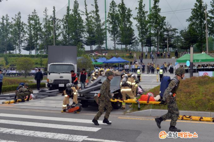 ³²±¸´Â Áö³ 10¿ù 20ÀÏ Ä¥¼®µ¿ °í½Î¿ò³îÀÌ Àü¼ö±³À°°ü¿¡¼ ±ººÎ´ë¿Í °æÂû, ¼Ò¹æ¼, º´¿ø, Çѱ¹Àü·Â µî °ü°è±â°ü 15°÷°ú ÇÔ²² ÁöÁø°ú ºØ±«, ÈÀç µîÀ» µ¿¹ÝÇÑ º¹ÇÕÀç³ ¹ß»ý ½Ã³ª¸®¿À¿¡ µû¸¥ ½ÇÀü°ú °°Àº ´ë±Ô¸ð ÇÕµ¿ÈÆ·ÃÀ» ½Ç½ÃÇØ ±ä±Þ ´ëÇÇ ¹× ºÎ»óÀÚ‧ÀÌÀç¹Î ±¸È£ Á¶Ä¡ µî Àç³ »óȲº° ´ëÀÀÀ» ¿Ïº®ÇÏ°Ô ¼±º¸¿© Æò°¡À§¿øµéÀÇ È£ÆòÀ» À̲ø¾ú´Ù.