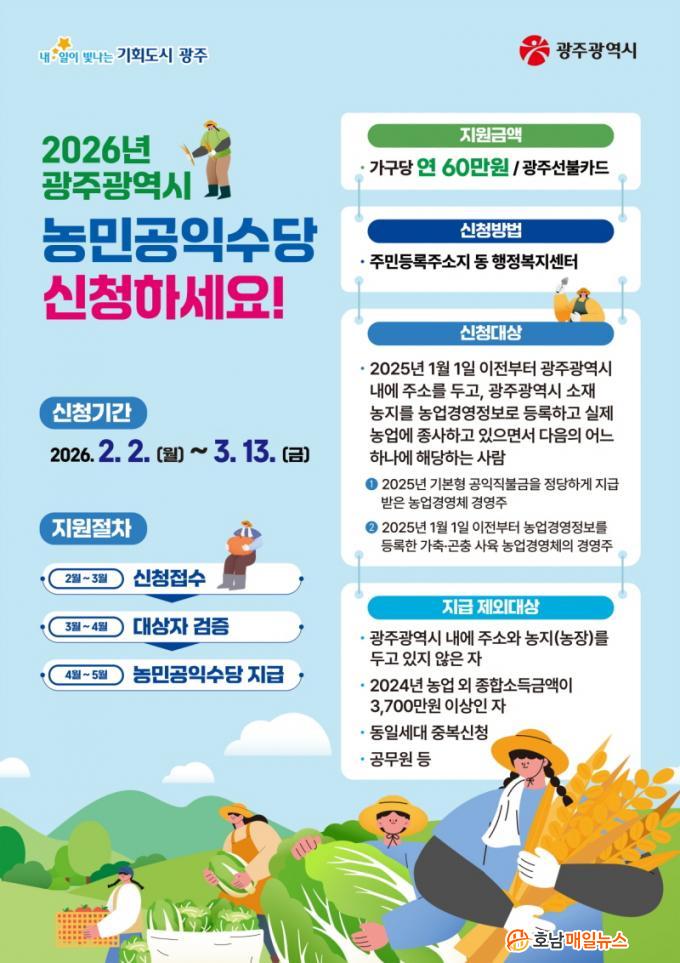 ³ó¹Î°øÀͼö´çÀº ³ó°¡´ç ¿¬ 60¸¸¿øÀÌ Áö±ÞµÇ¸ç, ±¤ÁÖÀºÇà ¼±ºÒÄ«µå·Î 4¿ù¸» Á¦°øµÉ ¿¹Á¤ÀÌ´Ù. ¿ÃÇØ ³ó¹Î°øÀͼö´ç Ä«µå »ç¿ë±âÇÑÀº 2026³â 12¿ù31ÀϱîÁöÀÌ´Ù.
