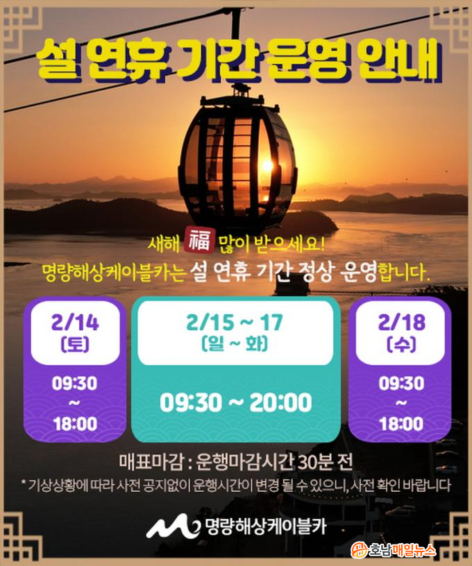 ¸í·®ÇØ»óÄÉÀ̺íÄ«´Â ¼³ ¿¬ÈÞ¸¦ ¸Â¾Æ °íÇâÀ» ¹æ¹®ÇÑ ±Í¼º°´µé°ú ÇØ³²°ú Áøµµ¸¦ ¹æ¹®ÇÑ °ü±¤°´µé¿¡°Ô º¸´Ù Æí¾ÈÇÑ ½Ã°£´ë¿¡ ÀÌ¿ëÇÒ ¼ö ÀÖµµ·Ï 2¿ù 15ÀÏ(ÀÏ)ºÎÅÍ ¼³³¯ ´çÀÏÀÎ 17ÀÏ(È)±îÁö 3Àϰ£, ±âÁ¸ ¿ÀÈÄ 6½Ã±îÁö¿´´ø ¿îÇà ½Ã°£À» ¿ÀÈÄ 8½Ã±îÁö·Î 2½Ã°£ ¿¬ÀåÇØ ¿î¿µÇÑ´Ù.