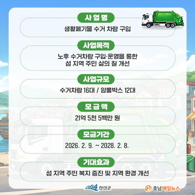À̹ø »ç¾÷ÀÇ ¸ð±Ý ¸ñÇ¥¾×Àº ÃÑ 21¾ï 5,500¸¸ ¿øÀ̸ç, ¸ð±Ý ±â°£Àº 2026³â 2¿ù 9ÀϺÎÅÍ 2028³â 2¿ù 8ÀϱîÁöÀÌ´Ù. ¸ð±ÝµÈ ±âºÎ±ÝÀº Àú»óÇü ¾Ï·Ñ 5Åæ Â÷·®°ú Áý°ÔÂ÷ µî »ýȰÆó±â¹° ¼ö°Å Â÷·® 16´ë¿Í ¾Ï·Ñ¹Ú½º(30§©) 12´ë¸¦ ±¸ÀÔÇÏ´Â µ¥ »ç¿ëµÉ ¿¹Á¤ÀÌ´Ù.