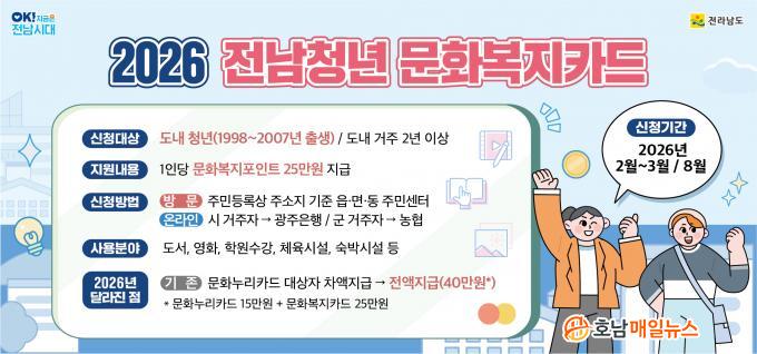 Àü³² û³â ¹®Èº¹ÁöÄ«µå´Â Áö¿ª û³â¿¡°Ô ¹®È Ȱµ¿ºñ¸¦ Áö¿øÇØ ¹®È»ýȰ°ú ÀÚ±â°è¹ß ±âȸ¸¦ Á¦°øÇÏ´Â »ç¾÷À¸·Î, ´ë»óÀÚ 1ÀÎ´ç ¿¬ 25¸¸ ¿øÀÇ ¹®Èº¹Áö Æ÷ÀÎÆ®¸¦ Áö±ÞÇÑ´Ù.