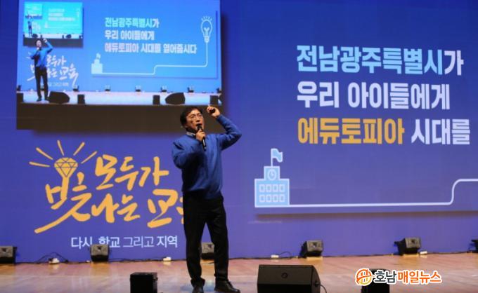 ¾Æ¿ï·¯ Àü³²°ú ±¤ÁÖ°¡ ÇϳªÀÇ ±³À°°øµ¿Ã¼·Î ³ª¾Æ°¡¾ß ÇÑ´Ù´Â Á¡µµ °Á¶µÆ´Ù. ±×´Â ¡°ÇàÁ¤ ÅëÇÕÀ» ³Ñ¾î ±³À°ÀÌ Áß½ÉÀÌ µÇ´Â ÅëÇÕÀÌ ÇÊ¿äÇÏ´Ù¡±¸ç ¡°¾ÆÀ̵éÀÌ Áö¿ªÀÇ °æ°è¸¦ ³Ñ¾î ´õ ³ÐÀº ±âȸ¸¦ ´©¸± ¼ö Àü³²±¤ÁÖÆ¯º°½Ã ¿¡µàÅäÇÇ¾Æ ½Ã´ë¡±¸¦ ¿¾î¾ß ÇÑ´Ù°í ¿ª¼³Çß´Ù.