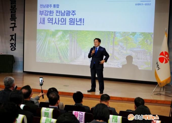 °±âÁ¤ ±¤ÁÖ½ÃÀåÀº ¡®Àü³²±¤ÁÖÅëÇÕÆ¯º°½Ã ¼³Ä¡¸¦ À§ÇÑ Æ¯º°¹ý¡¯ÀÇ ÁÖ¿ä ³»¿ë°ú 20Á¶¿ø ±Ô¸ðÀÇ Á¤ºÎ ÀçÁ¤ Áö¿øÀÌ °¡Á®¿Ã º¯È¿¡ ´ëÇØ ¼³¸íÇϰí, ÅëÇÕ ÀÌÈÄ ´ã¾ç±ºÀÇ ¹ßÀüÀü·«À» Á¦½ÃÇß´Ù.