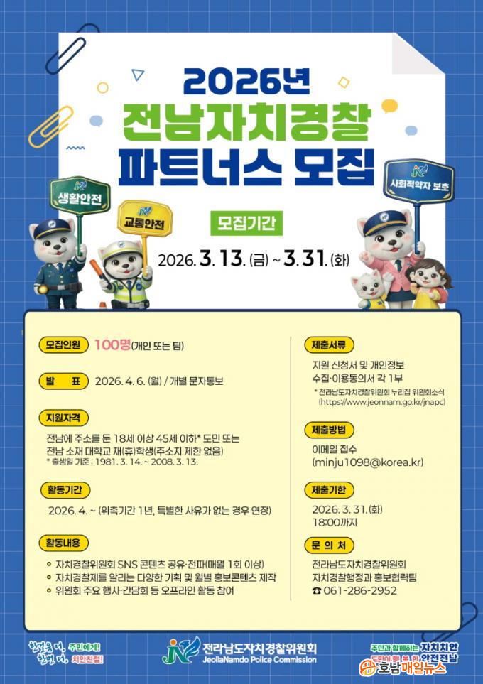 Àü³²ÀÚÄ¡°æÂû ÆÄÆ®³Ê½º´Â SNS ÄÜÅÙÃ÷ Á¦ÀÛ°ú È«º¸ Ȱµ¿À» ÅëÇØ ÀÚÄ¡°æÂû Á¦µµ¿Í Á¤Ã¥À» µµ¹Î¿¡°Ô ¾Ë¸®´Â È«º¸´ÜÀ¸·Î, °³ÀÎÀ̳ª ÆÀ ´ÜÀ§·Î ÃÑ 100¸íÀ» ¼±¹ßÇÒ ¿¹Á¤ÀÌ´Ù.