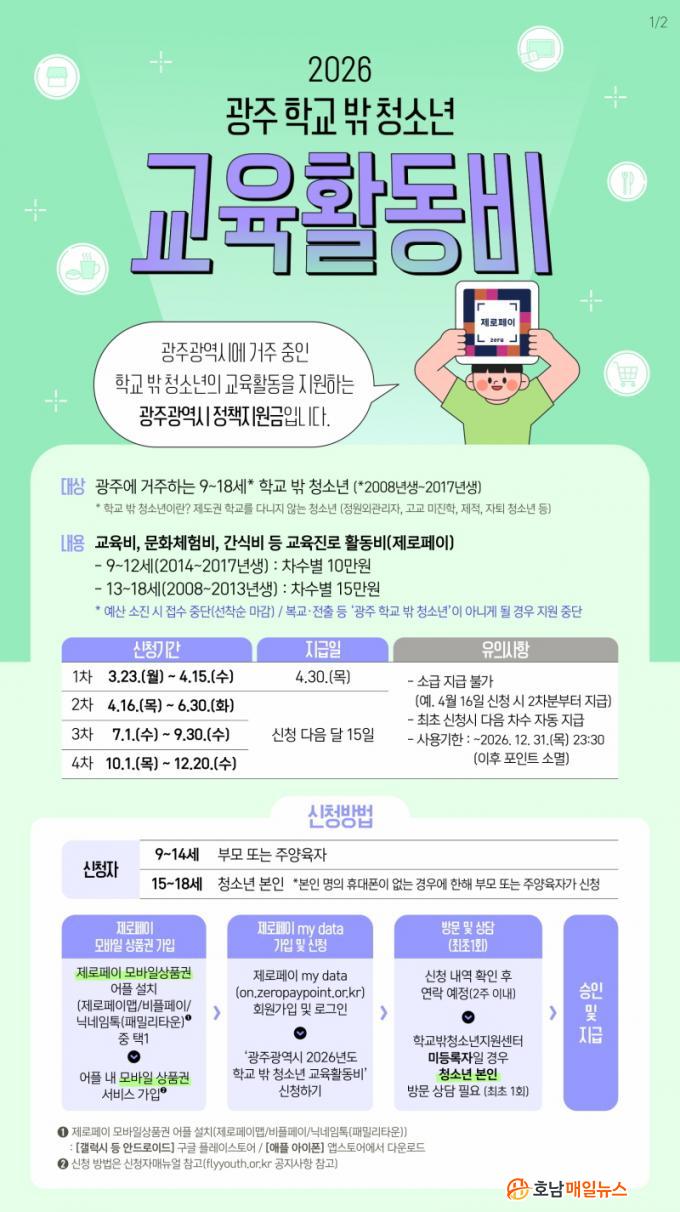 ±¤ÁÖ±¤¿ª½Ã(½ÃÀå °±âÁ¤)´Â Çб³ ¹Û û¼Ò³âÀÇ ±³À° ±âȸ¸¦ È®´ëÇÏ°í ¾ÈÁ¤ÀûÀÎ ¼ºÀåÀ» µÞ¹ÞħÇϱâ À§ÇØ ¡®Çб³ ¹Û û¼Ò³â ±³À°È°µ¿ºñ Áö¿ø»ç¾÷¡¯À» ¿î¿µÅ°·Î Çϰí, ¿À´Â 23ÀϺÎÅÍ ½ÅûÀ» ¹Þ´Â´Ù.