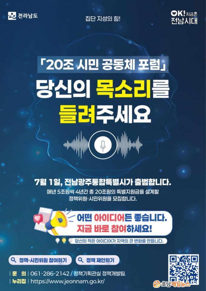 20Á¶ ½Ã¹Î°øµ¿Ã¼ Æ÷·³ ½Ã¹Î¡¤Á¤Ã¥À§¿ø Âü¿©¿Í Á¤Ã¥ Á¦¾ÈÀº Àü³²µµ ´©¸®Áý(www.jeonnam.go.kr)¿¡¼ Âü¿©¡¤Á¢¼öÇÒ ¼ö ÀÖ´Ù.