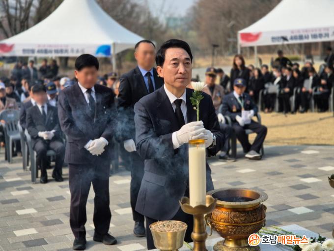 ¹Ú¼öÇö Ã⸶¿¹Á¤ÀÚ´Â ¡®¼ÇؼöÈ£ÀÇ ³¯¡¯À» ¸Â¾Æ õ¾È ÅÂÁ¶»ê ÃæÈ¥Å¾¿¡¼ ¿¸° õ¾ÈÇÔ 46¿ë»ç Ã߸ð½ÄÀ» ã¾Ò´Ù. ¹Ú¼öÇö Ã⸶¿¹Á¤ÀÚ´Â ¡°¿ì¸® ¿ë»çµéÀÇ ¼ÇØ ¼öÈ£¸¦ À§ÇÑ Èñ»ýÀ» ±íÀÌ ±â¸®¸ç, ±»°ÇÇÑ ¾Èº¸ À§¿¡ Çѹݵµ ÆòÈ¿Í ¹ø¿µÀ» ²ÉÇÇ¿ì°Ú´Ù´Â ¸¶À½À» ´Ù½Ã »õ±ä´Ù¡±¸ç ¡°À¯°¡Á·ÀÇ ½½Çİú ±×¸®¿òÀ» Â÷¸¶ ´Ù Çì¾Æ¸± ¼ö ¾ø´Ù. ±íÀº À§·Î¿Í ÇÔ²² ±¹°¡°¡ Ç×»ó °ç¿¡ ÀÖµµ·Ï ³ë·ÂÇϰڴٴ ¸»¾¸À» µå¸°´Ù¡±°í ¸»Çß´Ù.