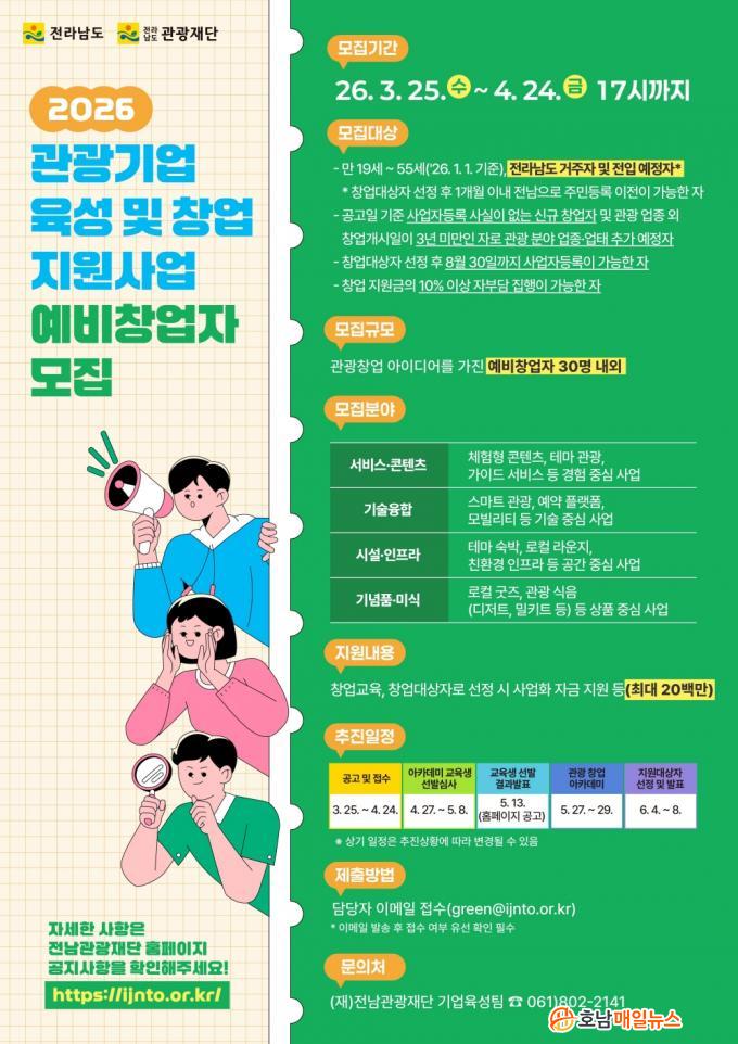 4¿ù 24ÀÏ ¿ÀÈÄ 5½Ã±îÁö À̸ÞÀÏ·Î Á¢¼öÇϸç, ÀÚ¼¼ÇÑ »çÇ×Àº Àü³²µµ(jeonnam.go.kr)¿Í Àü³²°ü±¤Àç´Ü(ijnto.or.kr) ´©¸®Áý¿¡¼ È®ÀÎÇÒ ¼ö ÀÖ´Ù.