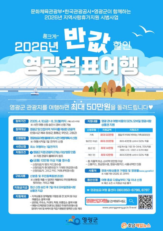 1ÀÎ ´ç 20¸¸ ¿ø ¼Òºñ ½Ã ÃÖ´ë 10¸¸ ¿ø, °¡Á· ´ÜÀ§ °ü±¤°´¿¡°Ô´Â 5ÀαîÁö ÃÖ´ë 50¸¸ ¿ø, û³â °ü±¤°´¿¡°Ô´Â ¿©Çà°æºñ 70%ÀÎ 1Àδç ÃÖ´ë 14¸¸ ¿øÀ» Áö¿øÇÏ´Â ¿µ±¤ ½°Ç¥¿©ÇàÀÇ Áö¿ø Á¶°Ç°ú ½Åû ¹æ¹ý, ±¸ºñ¼·ù µî ÀÚ¼¼ÇÑ »çÇ×Àº ¿µ±¤ ½°Ç¥ ¿©Çà ´©¸®Áý (https://www.yeonggwang.go.kr/travel)À» ÅëÇØ È®ÀÎÇÒ ¼ö ÀÖ´Ù.