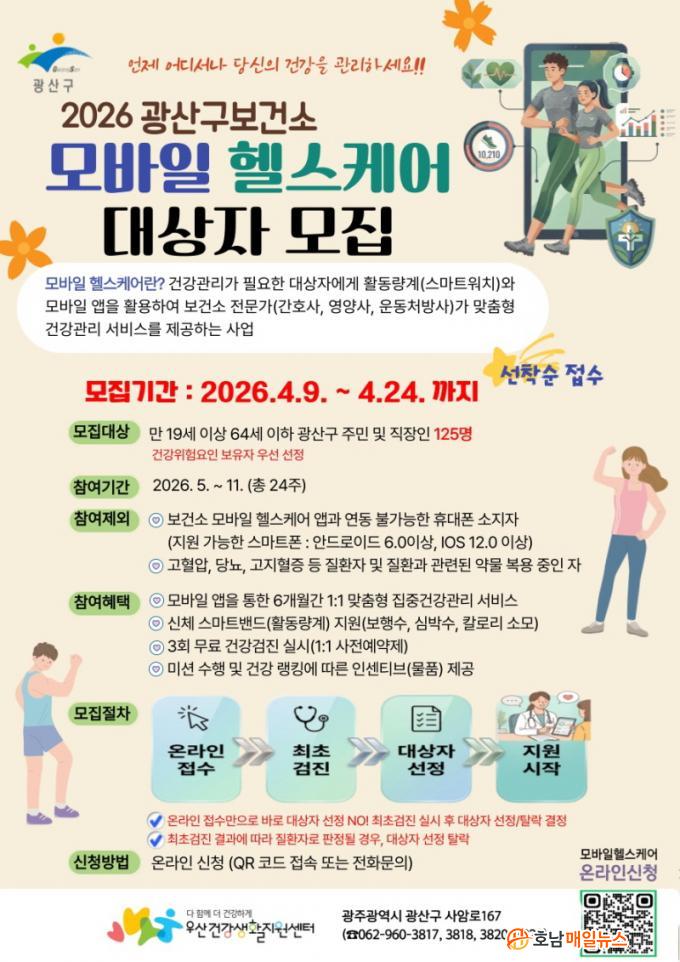 Áö¿ø ´ë»óÀº Ç÷¾Ð, Ç÷´ç, Ç㸮µÑ·¹ µî °Ç° À§Çè ¿äÀÎÀ» °¡Áö°í ÀÖ´Â ¸¸ 19¼¼ ÀÌ»ó 64¼¼ ÀÌÇÏ ±¤»ê±¸ ÁÖ¹Î, Á÷ÀåÀÎÀÌ´Ù. ¼±Á¤µÈ ´ë»óÀÚ¿¡°Ô´Â ¹«·á °Ç°°ËÁø°ú ÃøÁ¤ °á°ú¿¡ µû¶ó ½º¸¶Æ® Ȱµ¿·®°è¸¦ Áö±ÞÇϰųª °³Àαâ±â¸¦ ¿¬µ¿ÇØ »ç¾÷¿¡ Âü¿©ÇÒ ¼ö ÀÖ´Ù.
