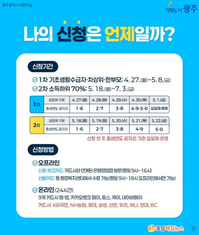 Áö¿ø ½ÅûÀº ¿Â¶óÀΰú ¿ÀÇÁ¶óÀÎ ¸ðµÎ °¡´ÉÇÏ´Ù. ¿Â¶óÀÎÀº 9°³ Ä«µå»ç(KB±¹¹Î¡¤NH³óÇù¡¤·Ôµ¥¡¤»ï¼º¡¤½ÅÇÑ¡¤¿ì¸®¡¤Çϳª¡¤Çö´ë¡¤BC) ȨÆäÀÌÁö ¹× ¾Û, īī¿À¹ðÅ©¡¤ÆäÀÌ, Å佺, ÄÉÀ̹ðÅ©, ³×À̹öÆäÀ̸¦ ÅëÇØ 24½Ã°£ ½ÅûÇÒ ¼ö ÀÖ´Ù. ¿ÀÇÁ¶óÀÎ ½ÅûÀÇ °æ¿ì ½Å¿ë¡¤Ã¼Å©Ä«µå ÃæÀüÀº ÇØ´ç ÀºÇà ¿µ¾÷Á¡À», ¼±ºÒÄ«µå ¼ö·ÉÀº µ¿ ÇàÁ¤º¹Áö¼¾Å͸¦ ¹æ¹®ÇÏ¸é µÈ´Ù.
